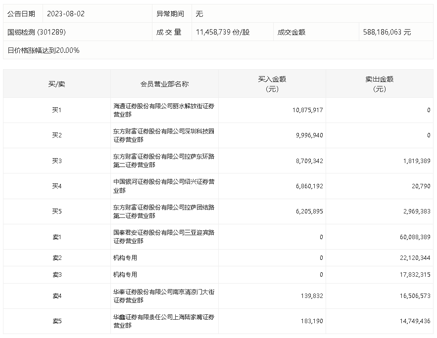 8月2日,国缆检测今日涨停,龙虎榜数据显示,上榜营业部席位全天成交1.79亿元,占当日总成交金额比例为30.45%。其中,买入金额为4297.13万元,卖出金额为1.36亿元,合计净卖出9313.53万元。