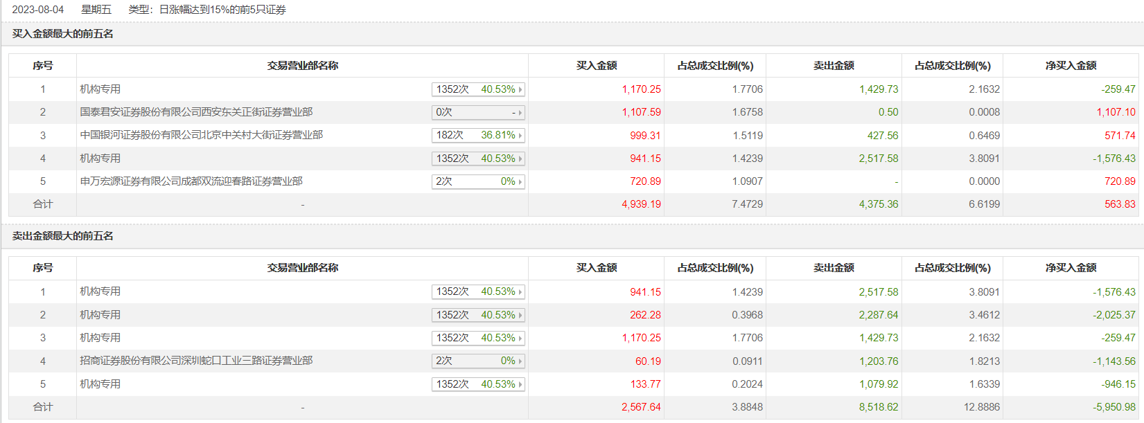 8月4日20CM涨停,成交额6.61亿元,换手率52.61%,盘后龙虎榜数据显示,四机构专用席位净卖出4807.42万元。