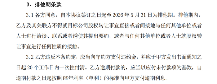 意向协议中设置了排他期条款:自签署日至2026年5月31日期间,武汉医佳宝股东不得与其他方洽谈股权转让事宜,违约将承担高额违约金及8%年利率的逾期利息。