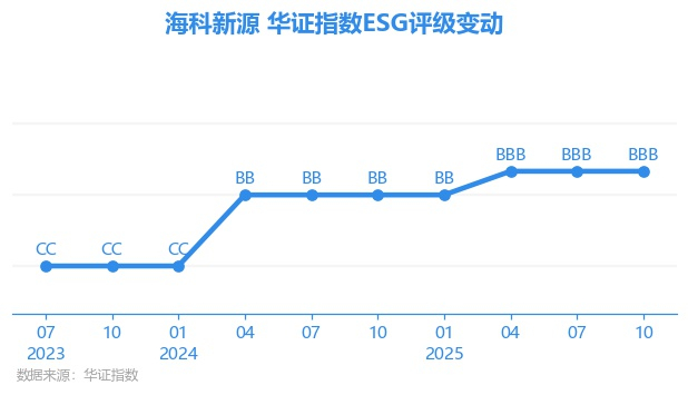 日前,华证指数公布了新一期(2025年10月31日)的ESG评级结果,海科新源(301292.SZ)获得BBB评级(华证指数评级为C起至AAA九档,C为最低档,AAA为其最高一级评级/AA为其第二档),上一期(2025年7月31日)ESG评级为BBB。本期ESG评级在494家化学制品行业A股上市公司中排名第108(上一期排名第99)。