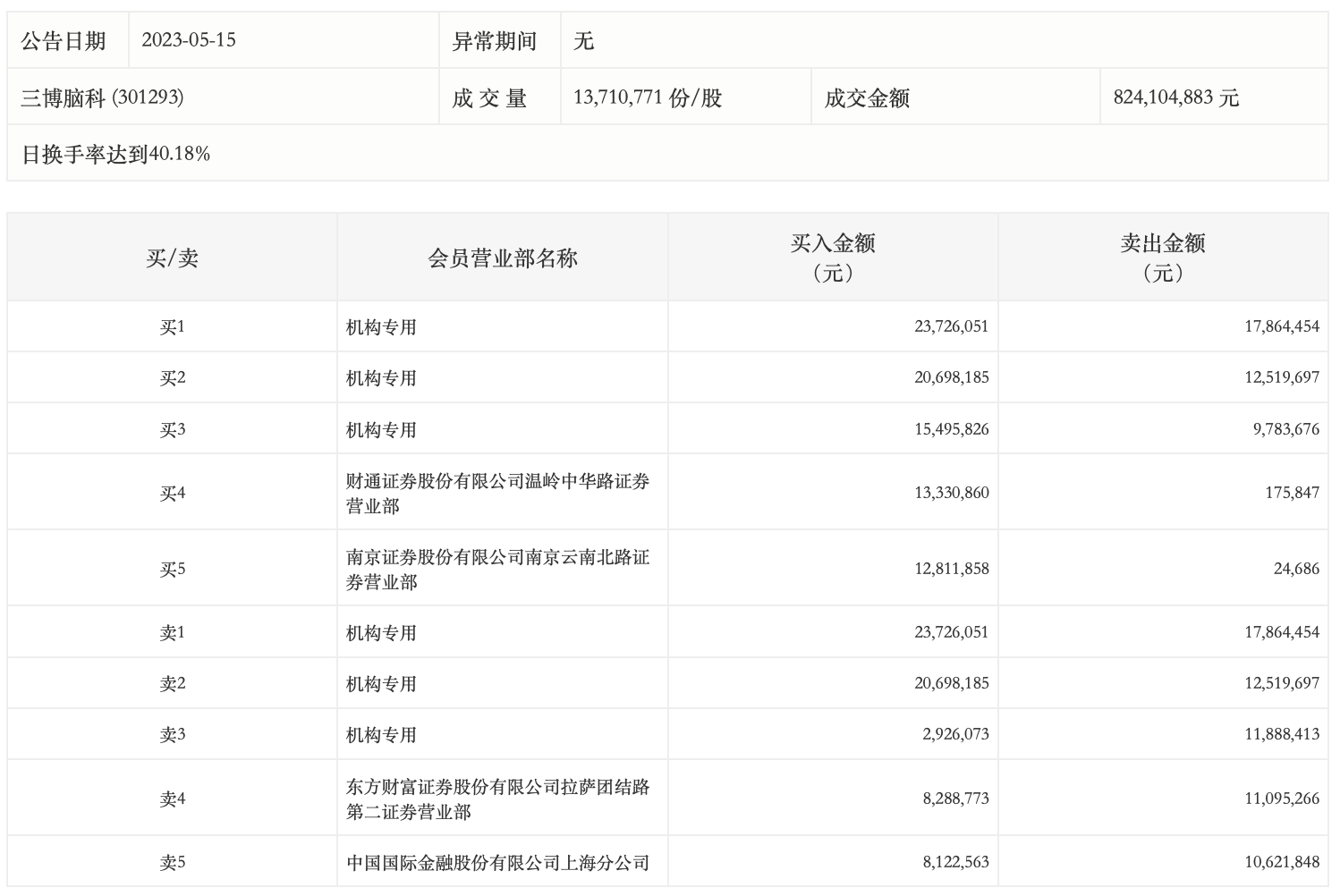 5月15日,三博脑科今日涨停,龙虎榜数据显示,上榜营业部席位全天成交1.79亿元,占当日总成交金额比例为21.77%。其中,买入金额为1.05亿元,卖出金额为7397.39万元,合计净买入3142.63万元。