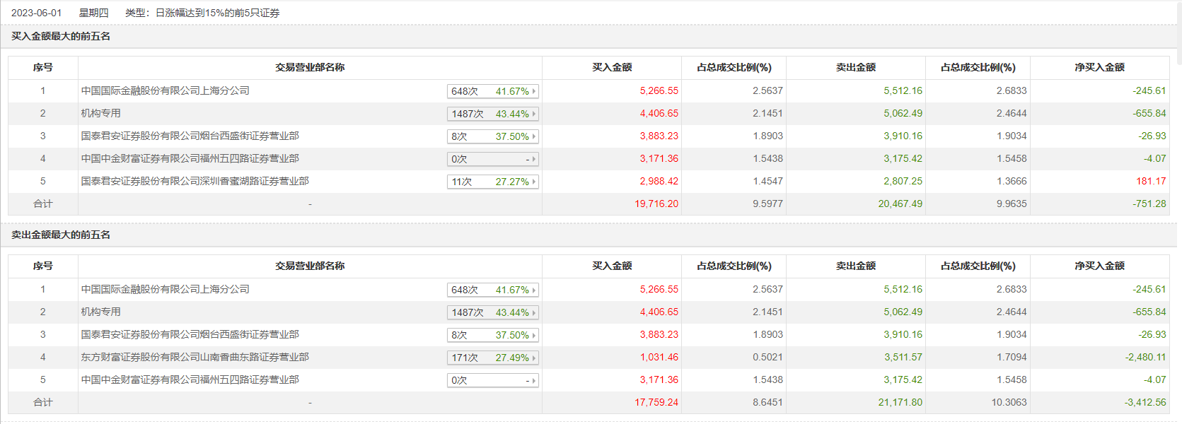 具体来看,机构买入4406.65万元,卖出5062.49万元,合计净卖出655.84万元。此外,中国国际金融上海分公司、国泰君安证券烟台西盛街证券营业部分别买入5266.55万元、3883.23万元;中国国际金融上海分公司、国泰君安证券烟台西盛街证券营业部分别卖出5512.16万元、3910.16万元。