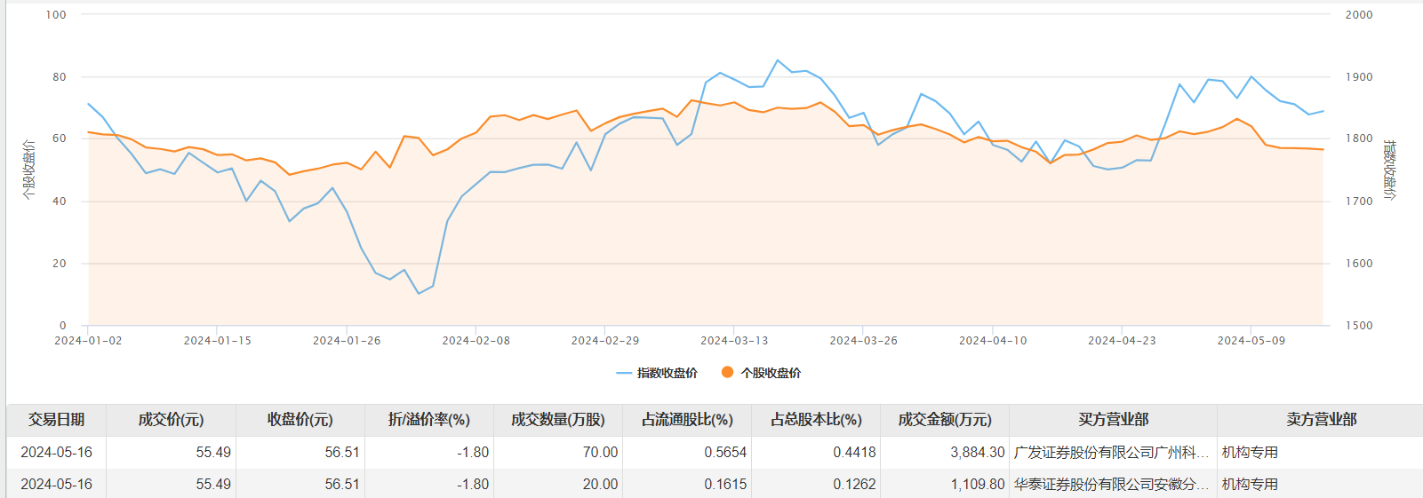 5月16日大宗交易成交90万股,成交额4994.1万元,占当日总成交额的28.39%,成交价55.49元,较市场收盘价56.51元折价1.8%。