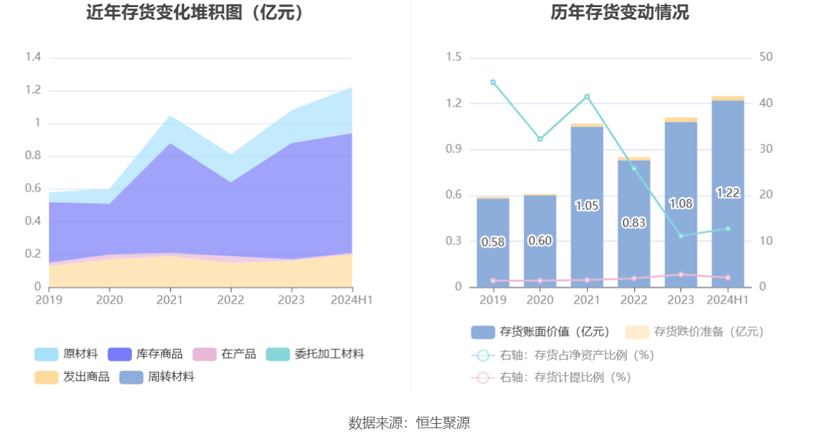 从存货变动来看,截至2024年上半年末,公司存货账面价值为1.22亿元,占净资产的12.8%,较上年末增加1369.34万元。其中,存货跌价准备为259.64万元,计提比例为2.09%。