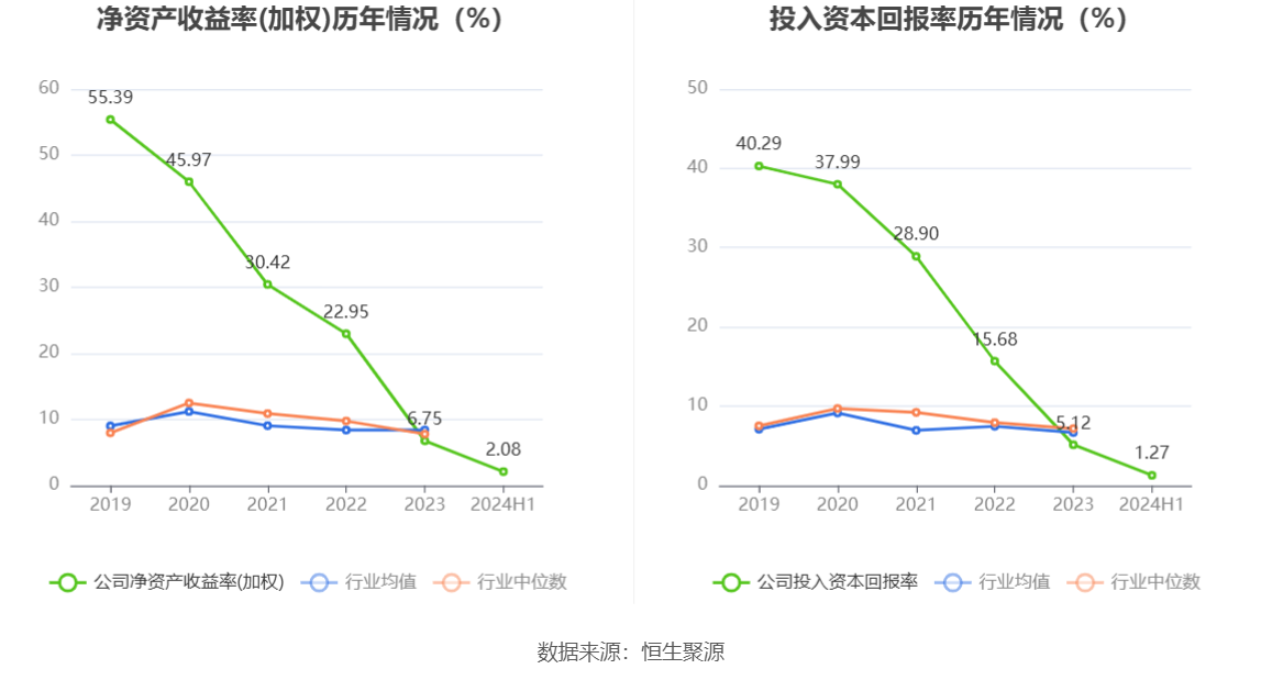 数据显示,2024年上半年公司加权平均净资产收益率为2.08%,较上年同期下降5.79个百分点;公司2024年上半年投入资本回报率为1.27%,较上年同期下降2.79个百分点。