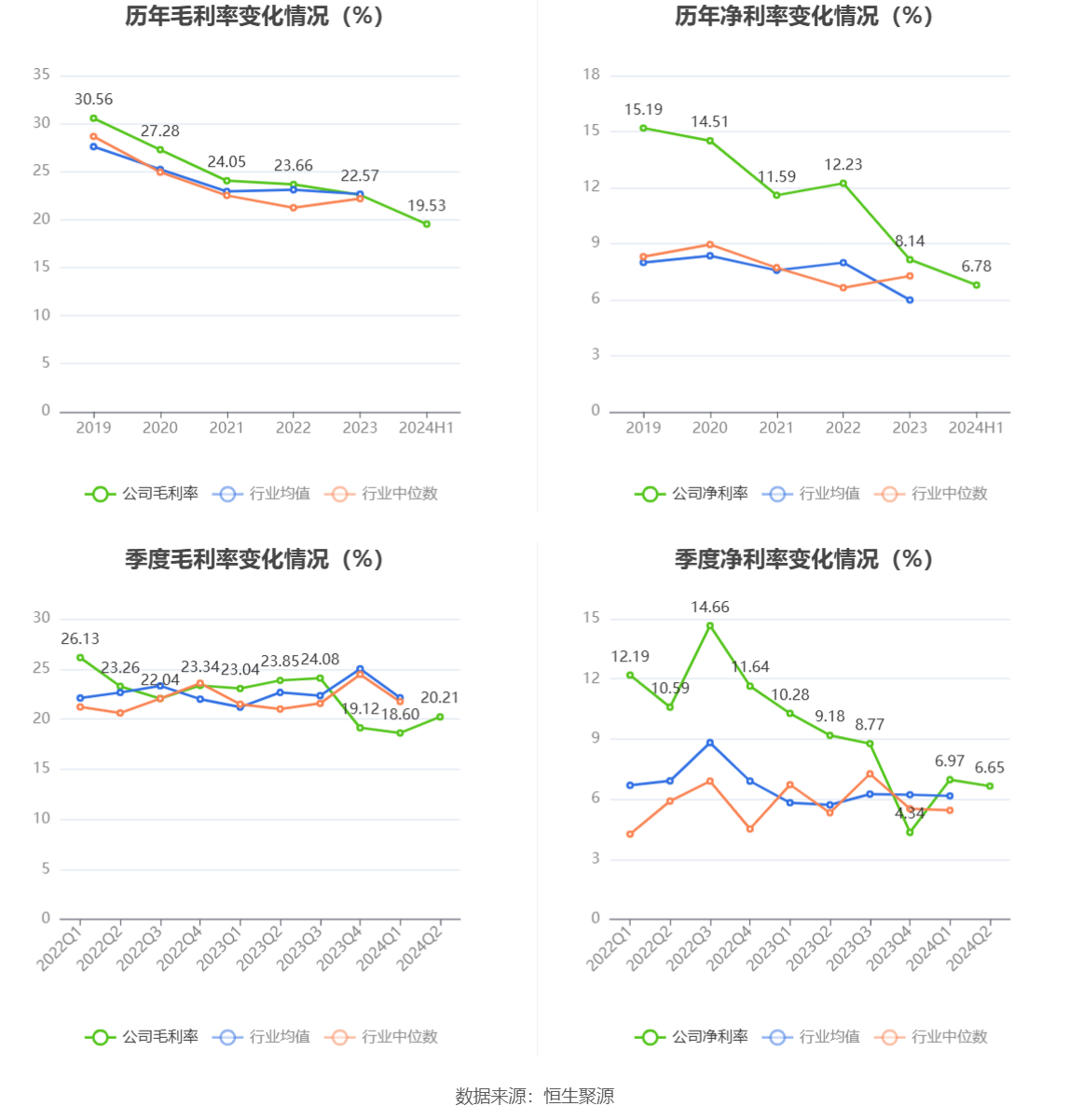 2024年上半年,公司毛利率为19.53%,同比下降3.97个百分点;净利率为6.78%,较上年同期下降2.88个百分点。从单季度指标来看,2024年第二季度公司毛利率为20.21%,同比下降3.64个百分点,环比上升1.61个百分点;净利率为6.65%,较上年同期下降2.53个百分点,较上一季度下降0.32个百分点。
