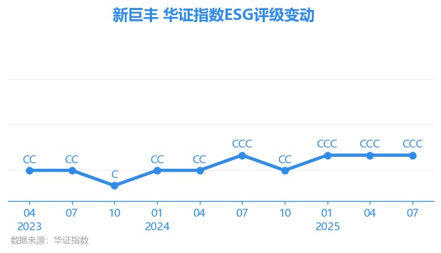 日前,华证指数公布了新一期(2025年7月31日)的ESG评级结果,新巨丰(301296.SZ)获得CCC评级(华证指数评级为C起至AAA九档,C为最低档,AAA为其最高一级评级/AA为其第二档),上一期(2025年4月30日)ESG评级为CCC。本期ESG评级在62家容器与包装行业A股上市公司中排名第30(上一期排名第24)。