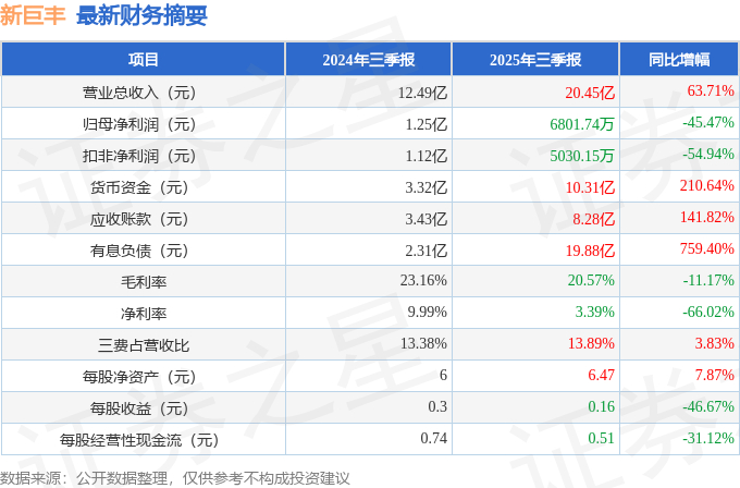 据证券之星公开数据整理,近期新巨丰(301296)发布2025年三季报。截至本报告期末,公司营业总收入20.45亿元,同比上升63.71%,归母净利润6801.74万元,同比下降45.47%。按单季度数据看,第三季度营业总收入7.92亿元,同比上升85.75%,第三季度归母净利润901.69万元,同比下降76.74%。本报告期新巨丰应收账款上升,应收账款同比增幅达141.82%。