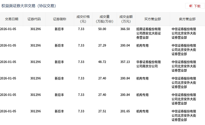 1月5日,新巨丰大宗交易成交208.32万股,成交额1527万元,占当日总成交额的26.28%,成交价7.33元,较市场收盘价8.7元折价15.75%。
