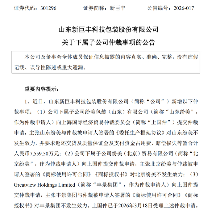 据深交所官网,2026年3月19日,山东新巨丰科技包装股份有限公司(证券代码:301296,简称“新巨丰”)发布《关于下属子公司仲裁事项的公告》(以下简称“仲裁事项公告”),披露其下属三家子公司近日向上海国际经济贸易仲裁委员会(简称“上国仲”)提交仲裁申请,涉及合同效力认定及保证金返还等事项,其中一起仲裁涉案金额暂合计7559.50万元。