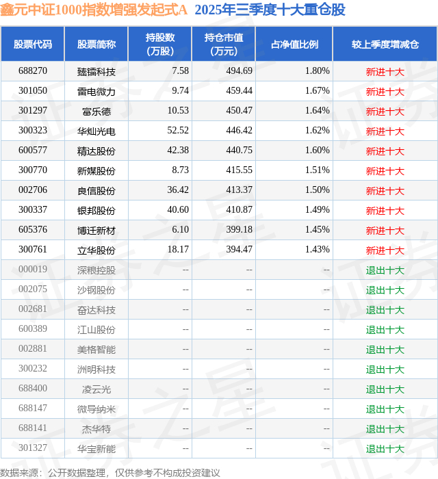 鑫元中证1000指数增强发起式A的前十大重仓股如下: