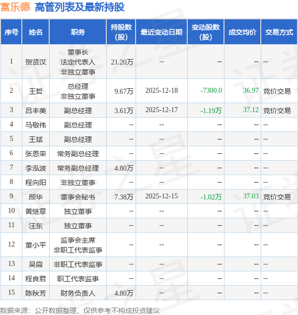 证券之星消息,根据12月30日市场公开信息、上市公司公告及交易所披露数据整理,富乐德(301297)最新董监高及相关人员股份变动情况:2025年12月29日公司董事,高管王哲、高管吕丰美、高管李泓波、董秘颜华共减持公司股份1200.0股,占公司总股本为0.0004%。变动期间公司股价下跌1.36%,12月29日当日收盘报35.61元。