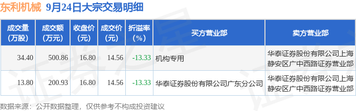 9月24日东利机械现2笔折价13.33%的大宗交易 合计成交701.79万元