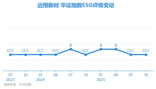 日前,华证指数公布了新一期(2025年10月31日)的ESG评级结果,远翔新材(301300.SZ)获得CCC评级(华证指数评级为C起至AAA九档,C为最低档,AAA为其最高一级评级/AA为其第二档),上一期(2025年7月31日)ESG评级为CCC。本期ESG评级在494家化学制品行业A股上市公司中排名第263(上一期排名第248)。