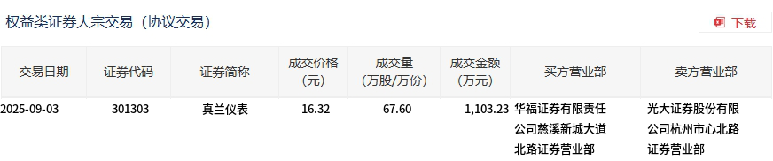 真兰仪表今日大宗交易平价成交67.6万股,成交额1103.23万元