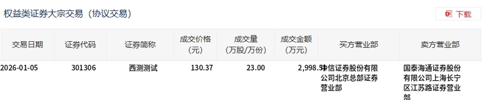 1月5日,西测测试大宗交易成交23万股,成交额2998.51万元,占当日总成交额的1.35%,成交价130.37元,较市场收盘价137.23元折价5%。