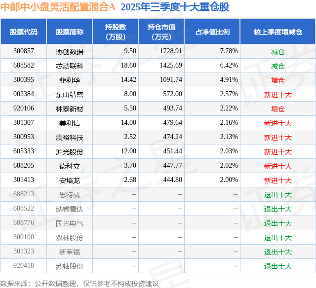 中邮中小盘灵活配置混合A的前十大重仓股如下: