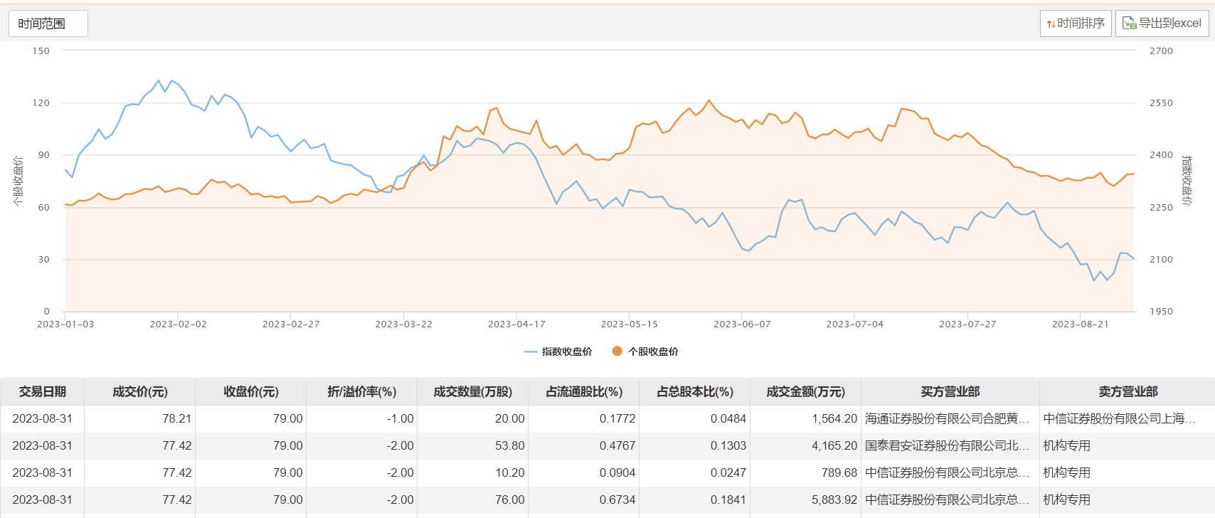 今日大宗交易成交160万股,成交额1.24亿元,占当日总成交额的17.99%,成交均价77.52元,较市场收盘价折价1.87%,其中最高成交价78.21元,最低成交价77.42元。