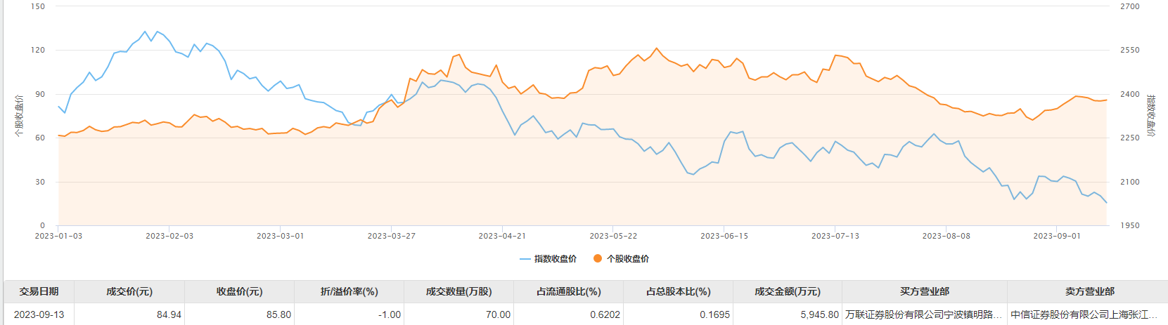 今日大宗交易成交70万股,成交额5945.8万元,占当日总成交额的8.61%,成交价84.94元,较市场收盘价85.8元折价1.0%。