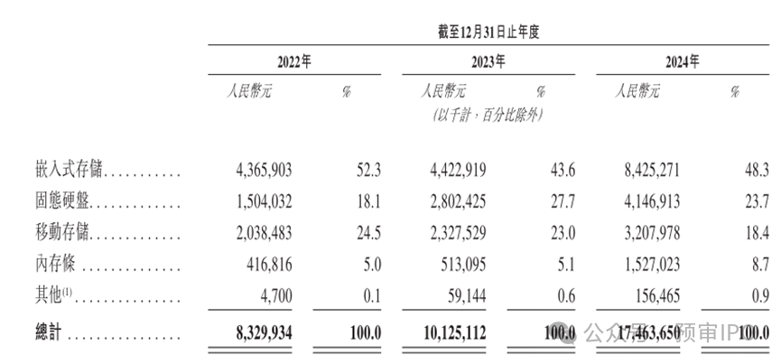 2022年-2024年,江波龙的收入分别为83.3亿元、101.25亿元及174.64亿元,逐年增长。嵌入式存储是江波龙的主要产品线,也是公司主要的收入来源,业务收入占比各期总收入的52.3%、43.6%及48.3%。