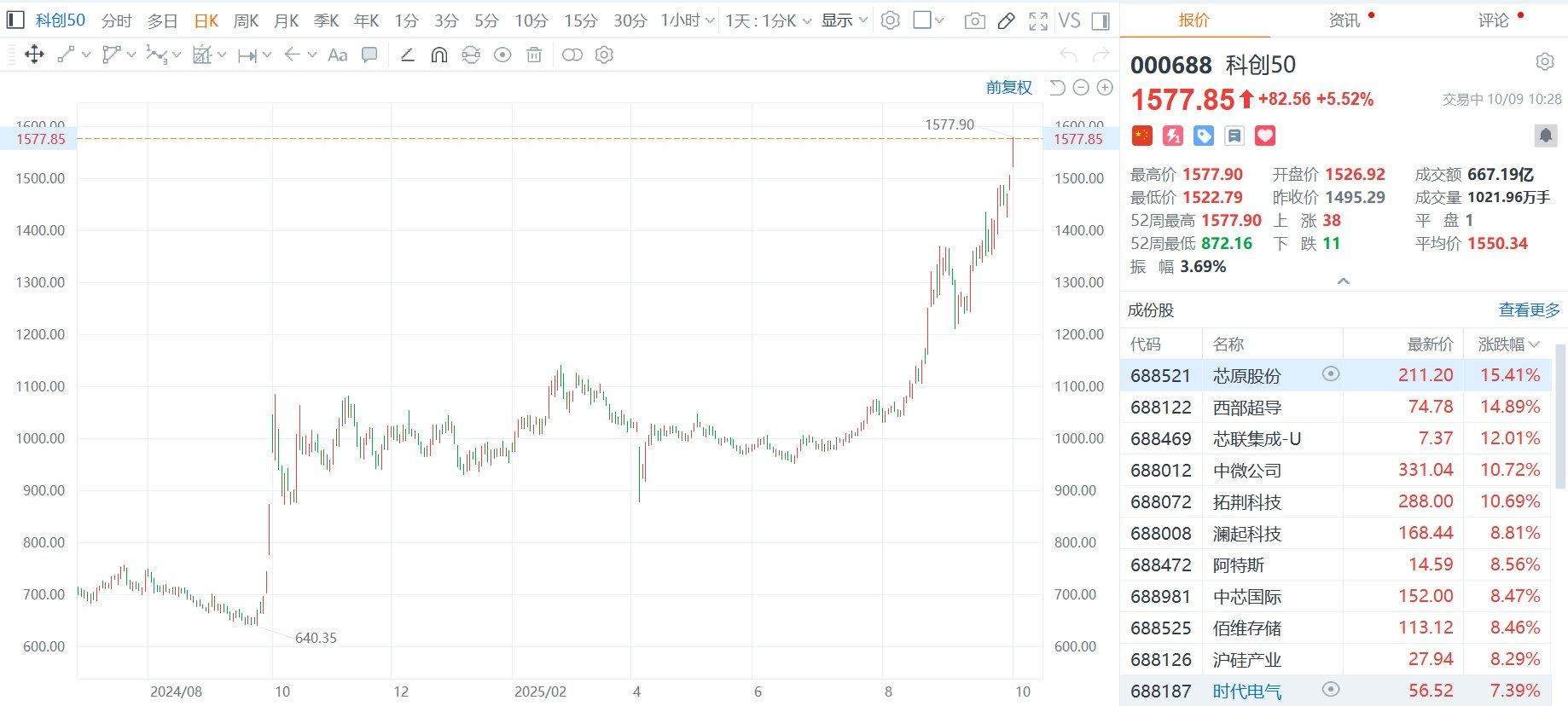 格隆汇10月9日|科创50指数涨幅扩大至超5%。中芯国际、华虹公司、江波龙、灿芯股份、芯联集成等多只芯片股创历史新高。西部超导(688122)、芯原股份均涨超15%,中微公司(688012)涨超10%。