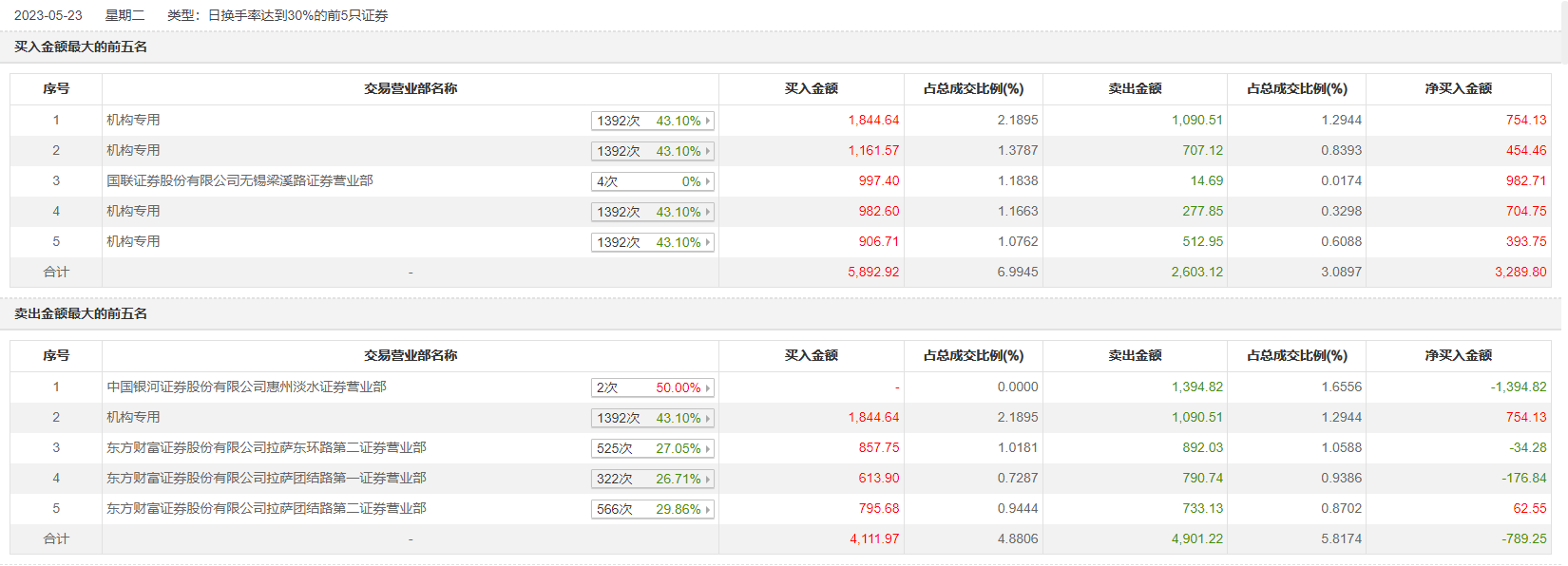 具体来看,机构买入4895.52万元,卖出2588.43万元,合计净买入2307.09万元。此外,国联证券无锡梁溪路证券营业部、东方财富证券拉萨东环路第二证券营业部分别买入997.40万元、857.75万元;中国银河证券惠州淡水证券营业部、东方财富证券拉萨东环路第二证券营业部分别卖出1394.82万元、892.03万元。