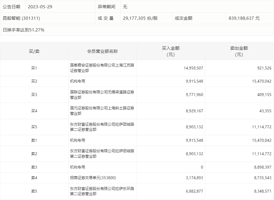 5月29日,昆船智能今日涨3.21%,龙虎榜数据显示,上榜营业部席位全天成交1.16亿元,占当日总成交金额比例为13.88%。其中,买入金额为6253.71万元,卖出金额为5394.14万元,合计净买入859.57万元。