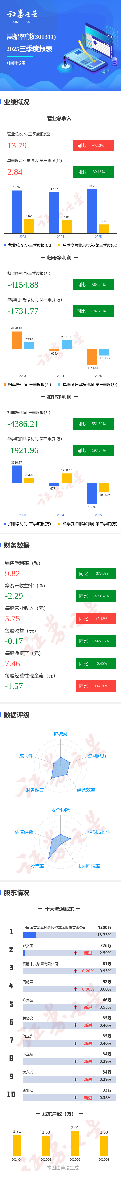 证券之星消息,昆船智能2025年三季报显示,前三季度公司主营收入13.79亿元,同比上升7.14%;归母净利润-4154.88万元,同比下降565.41%;扣非净利润-4386.21万元,同比下降551.6%;其中2025年第三季度,公司单季度主营收入2.84亿元,同比下降30.19%;单季度归母净利润-1731.77万元,同比下降182.79%;单季度扣非净利润-1921.96万元,同比下降197.05%;负债率57.28%,投资收益2.48万元,财务费用539.4万元,毛利率9.81%。