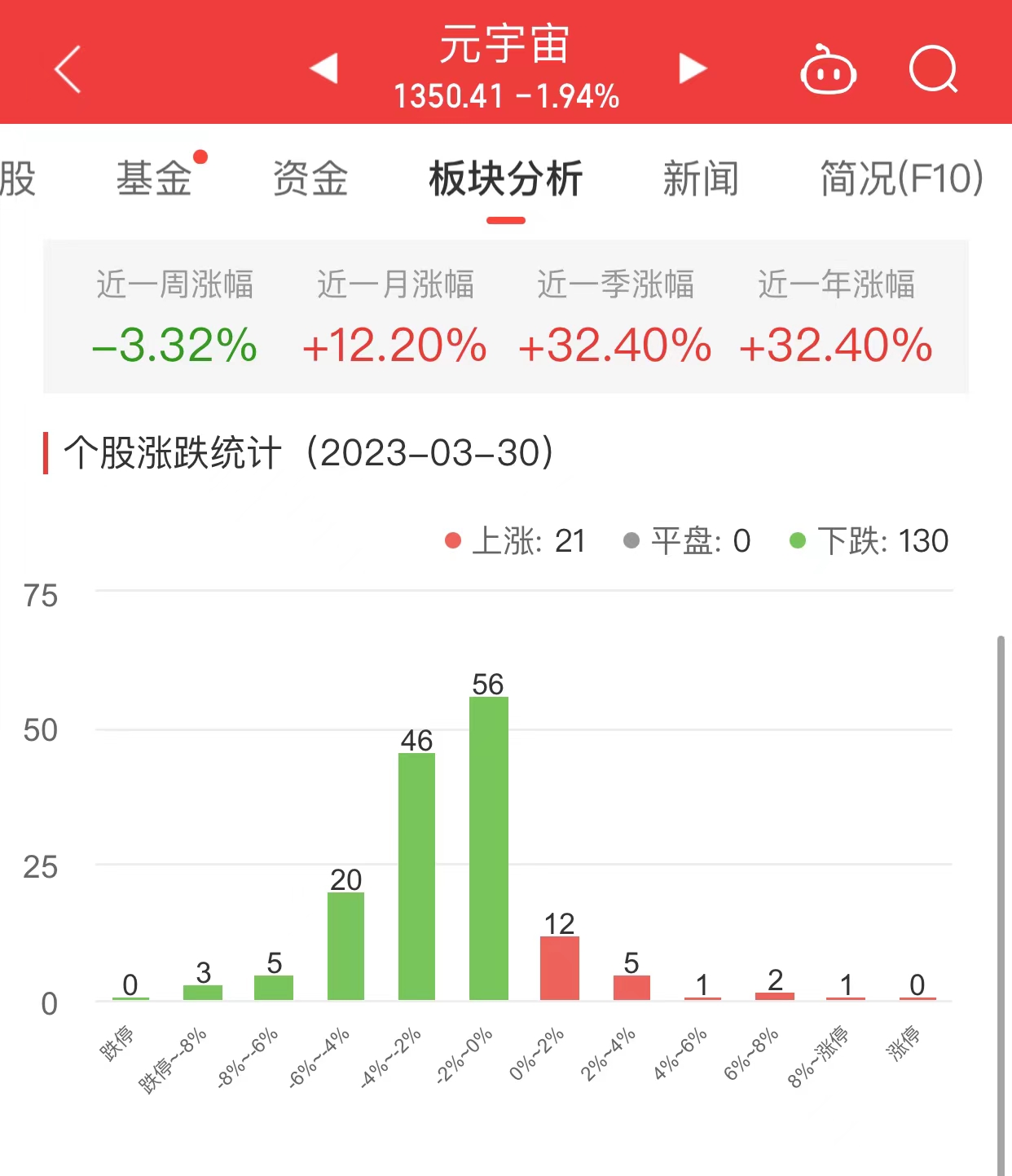 中国经济网北京3月30日讯今日,元宇宙板块整体跌幅1.94%,其中21只股票上涨,0只股票平盘,130只股票下跌。