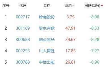 岭南股份、零点有数、创业黑马、川大智胜、中信出版位列涨幅榜后五位,涨幅分别为-8.98%、-8.53%、-8.28%、-7.27%、-6.96%。