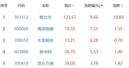 其中,智立方、海信视像、太龙股份、新华网、昆仑万维位列板块涨幅前五位,涨幅分别为9.66%、7.51%、6.28%、5.53%、3.78%。