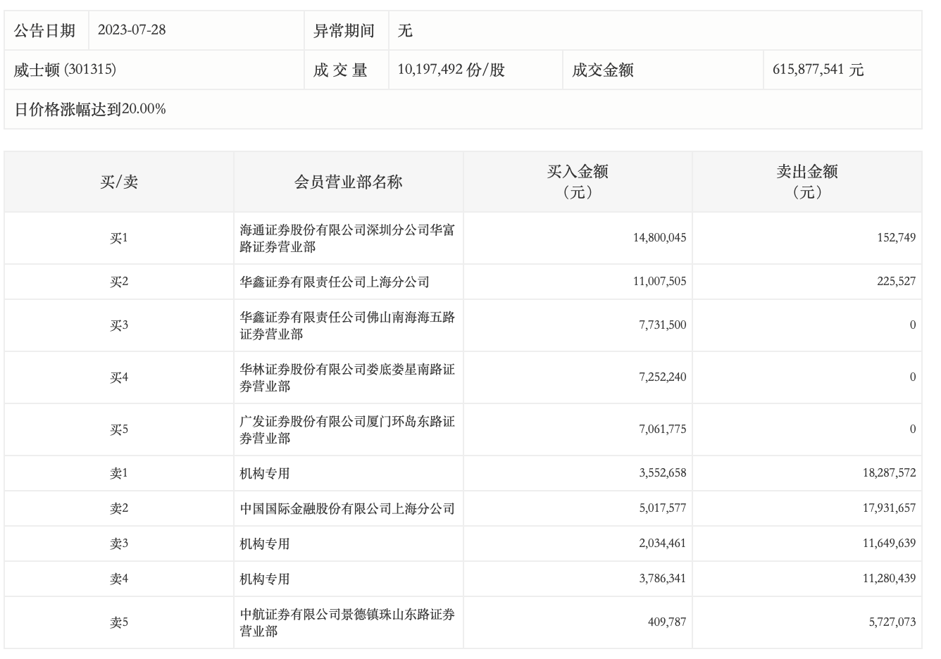 7月28日,威士顿今日涨停,龙虎榜数据显示,上榜营业部席位全天成交1.28亿元,占当日总成交金额比例为20.77%。其中,买入金额为6265.39万元,卖出金额为6525.47万元,合计净卖出260.08万元。