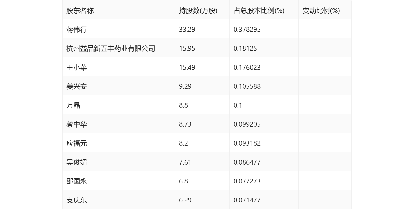 一季报显示,2024年一季度末公司十大流通股东中,新进股东为王小菜、姜兴安、万晶、蔡中华、应福元、吴俊媚、邵国永、支庆东,取代了上年末的香港中央结算有限公司、华泰证券股份有限公司、光大证券股份有限公司、中信证券股份有限公司、王典文、平安证券股份有限公司、中国国际金融香港资产管理有限公司-CICCFT4(QFII)、中国国际金融股份有限公司。在具体持股比例上,蒋伟行、杭州益品新五丰药业有限公司持股有所上升。