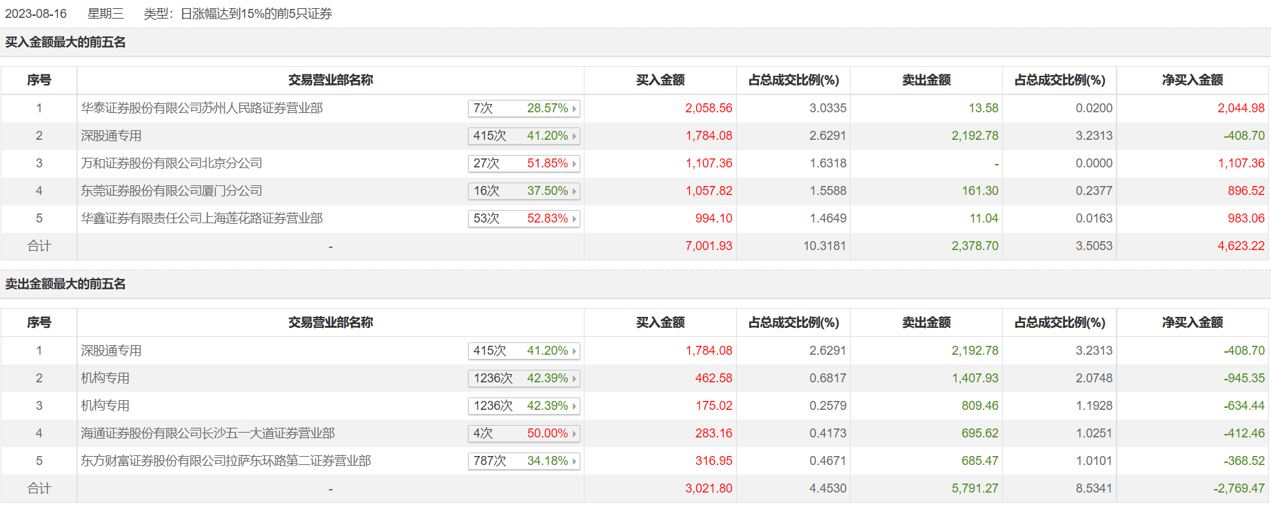 慧博云通8月16日涨停,龙虎榜数据显示,上榜营业部席位全天成交1.42亿元,占当日总成交金额比例为20.95%。其中,买入金额为8239.64万元,卖出金额为5977.19万元,合计净买入2262.45万元。