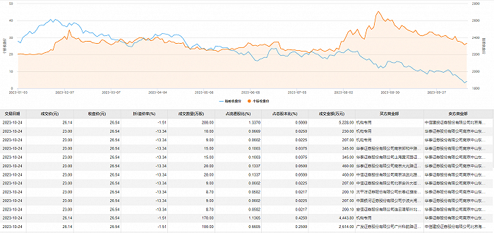 10月24日大宗交易成交594.4万股,成交额1.51亿元,占当日总成交额的41.66%,成交均价25.48元,较市场收盘价折价3.99%,其中最高成交价26.14元,最低成交价23元。