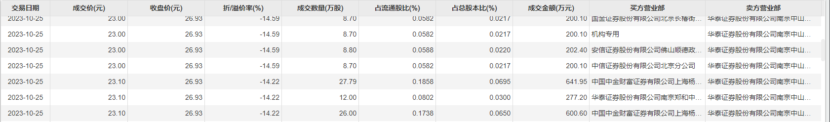 10月25日,慧博云通今日大宗交易成交264.19万股,成交额6260.65万元,占当日总成交额的11.84%,成交均价23.7元,较市场收盘价折价11.99%,其中最高成交价26.53元,最低成交价23元。