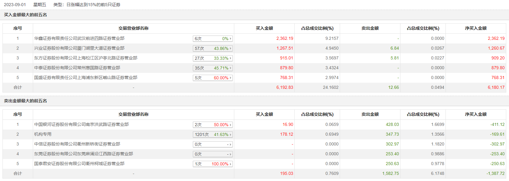 具体来看,机构买入178.12万元,卖出347.73万元,合计净卖出169.61万元。此外,华鑫证券武汉前进四路证券营业部、兴业证券厦门湖里大道证券营业部分别买入2362.19万元、1267.51万元;中国银河证券南京洪武路证券营业部、中信证券衢州新桥街证券营业部分别卖出428.03万元、302.97万元。