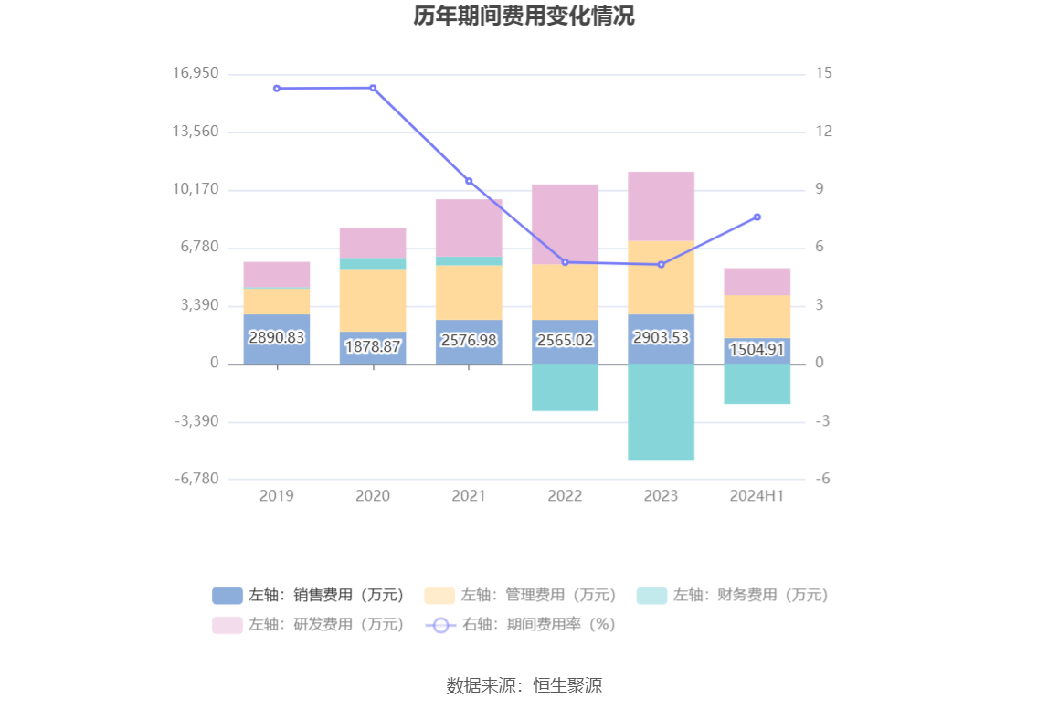 2024年上半年,公司期间费用为3241.80万元,较上年同期增加159.63万元;期间费用率为7.60%,较上年同期上升2.38个百分点。其中,销售费用同比下降9.3%,管理费用同比增长18.01%,研发费用同比下降14.38%,财务费用由去年同期的-2545.13万元变为-2348.13万元。