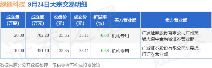 9月24日绿通科技现2笔大宗交易 机构净买入1053.3万元