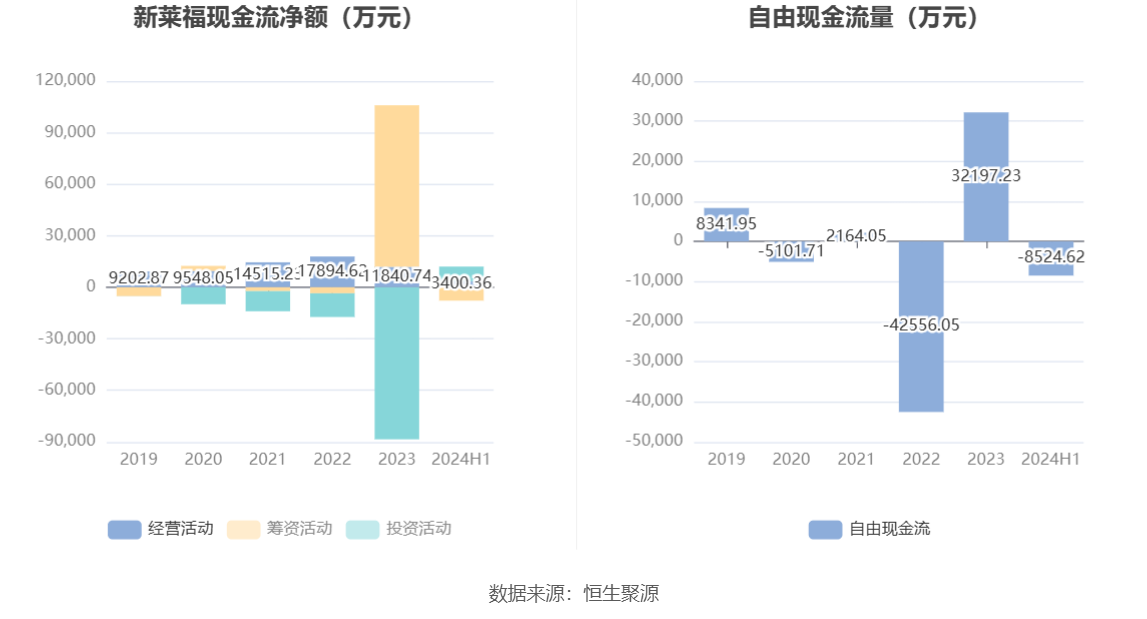 进一步统计发现,2024年上半年公司自由现金流为-8524.62万元,上年同期为2463.77万元。