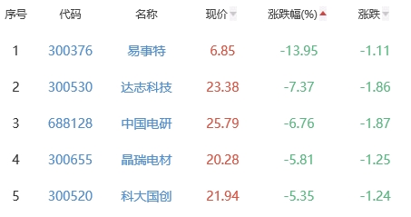 易事特、达志科技、中国电研、晶瑞电材、科大国创位列涨幅榜后五位,涨幅分别为-13.95%、-7.37%、-6.76%、-5.81%、-5.35%。