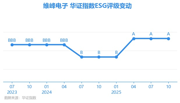 日前,华证指数公布了新一期(2025年10月31日)的ESG评级结果,维峰电子(301328.SZ)获得A评级(华证指数评级为C起至AAA九档,C为最低档,AAA为其最高一级评级/AA为其第二档),上一期(2025年7月31日)ESG评级为A。本期ESG评级在531家电子设备、仪器和元件行业A股上市公司中排名第49(上一期排名第46)。