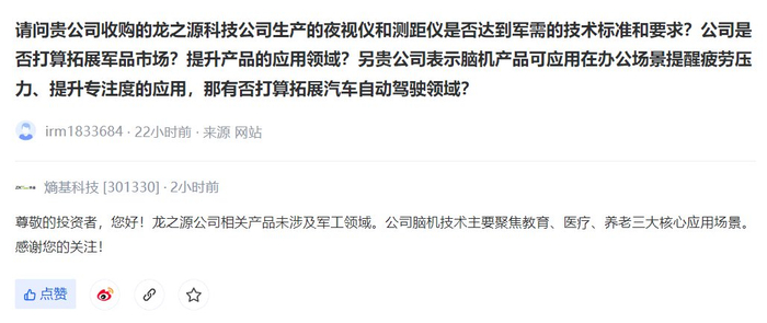 来源:深交所互动易【V观财报|熵基科技:收购的龙之源公司相关产品未涉及军工领域】针对“公司收购的龙之源科技公司生产的夜视仪和测距仪是否达到军需的技术标准和要求?公司是否打算拓展军品市场?”相关问题,熵基科技11月19日在互动平台回应称,龙之源公司相关产品未涉及军工领域。公司脑机技术主要聚焦教育、医疗、养老三大核心应用场景。(中新经纬APP)
