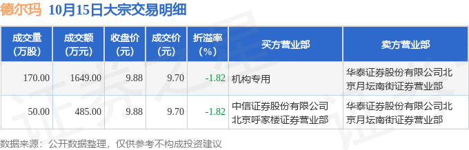 10月15日德尔玛现2笔大宗交易 机构净买入1649万元