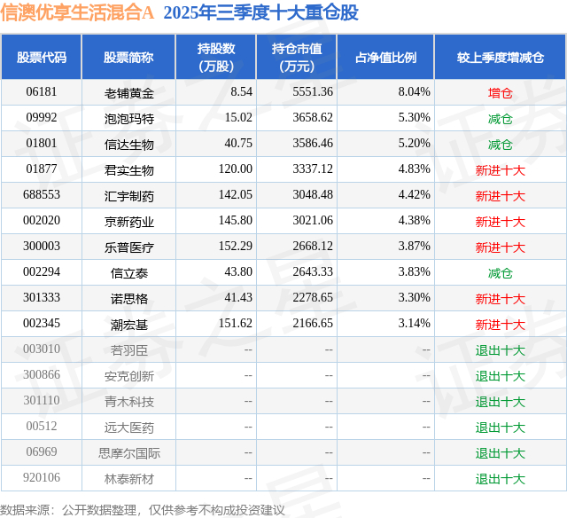 根据2025基金Q3季报公募基金重仓股数据,重仓该股的公募基金共2家,其中持有数量最多的公募基金为信达澳亚基金的信澳优享生活混合A。信澳优享生活混合A目前规模为1.92亿元,最新净值1.0775(12月26日),较上一交易日下跌0.36%,近一年上涨41.55%。该公募基金现任基金经理为杨珂。杨珂在任的基金产品包括:信澳健康中国混合A,管理时间为2020年5月13日至今,期间收益率为43.77%;