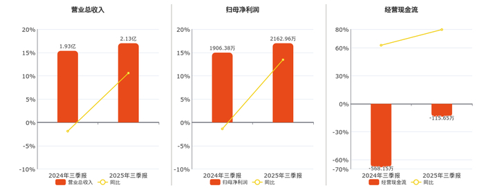 公司营业总收入为2.13亿元,在已披露的同业公司中排名第57。归母净利润为2162.96万元,在已披露的同业公司中排名第37。经营活动现金净流入为-115.65万元,在已披露的同业公司中排名第42。