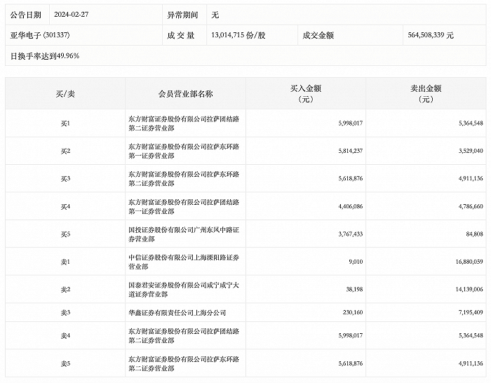 2月27日,亚华电子今日涨0.83%,龙虎榜数据显示,上榜营业部席位全天成交8277.27万元,占当日总成交金额比例为14.66%。其中,买入金额为2588.2万元,卖出金额为5689.07万元,合计净卖出3100.86万元。