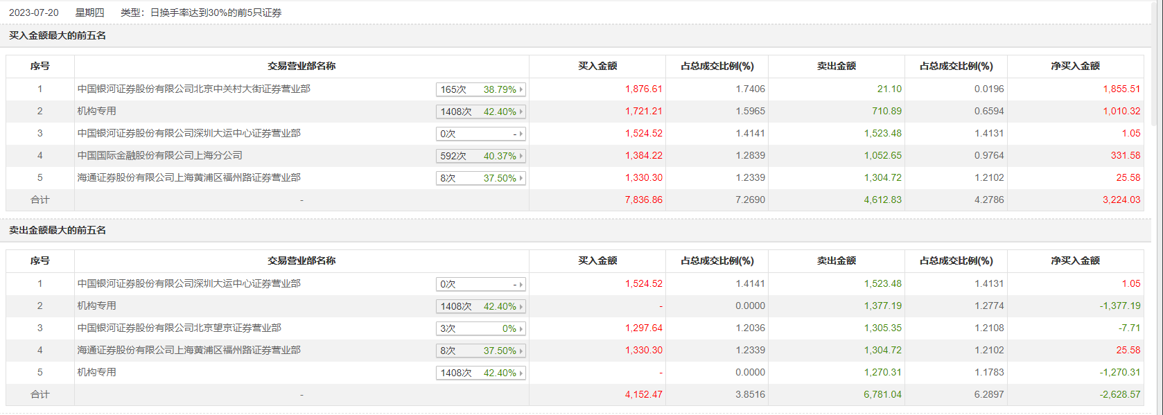 中关村大街证券营业部、中国银河证券深圳大运中心证券营业部分别买入1876.61万元、1524.52万元;中国银河证券深圳大运中心证券营业部、中国银河证券北京望京证券营业部分别卖出1523.48万元、1305.35万元。