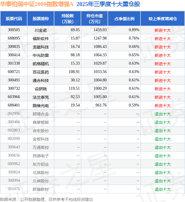 根据2025基金Q3季报公募基金重仓股数据,重仓该股的公募基金共3家,其中持有数量最多的公募基金为华泰柏瑞基金的华泰柏瑞中证2000指数增强A。华泰柏瑞中证2000指数增强A目前规模为3.12亿元,最新净值1.8562(1月6日),较上一交易日上涨1.0%,近一年上涨68.41%。该公募基金现任基金经理为盛豪 孔令烨 雷文渊。盛豪在任的基金产品包括:华泰柏瑞量化优选混合,管理时间为2015年10月13日至今,期间收益率为135.49%;华泰柏瑞量化阿尔法A,管理时间为2017年9月26日至今,期间收益率为79.18%;华泰柏瑞量化先行混合A,管理时间为2021年9月17日至今,期间收益率为20.16%;孔令烨在任的基金产品包括:华泰柏瑞量化驱动混合A,管理时间为2022年8月5日至今,期间收益率为30.46%;华泰柏瑞量化阿尔法A,管理时间为2025年9月10日至今,期间收益率为6.89%;华泰柏瑞上证科创板综合指数增强A,管理时间为2025年11月18日至今,期间收益率为1.91%。雷文渊在任的基金产品包括:华泰柏瑞量化优选混合,管理时间为2022年8月5日至今,期间收益率为27.97%;华泰柏瑞上证科创板综合指数增强A,管理时间为2025年11月18日至今,期间收益率为1.91%。
