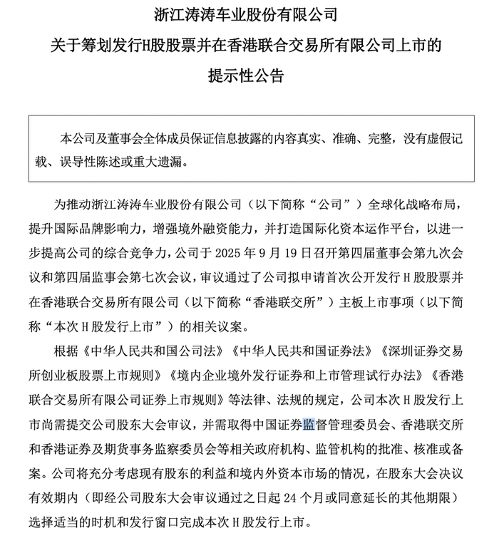 瑞财经 吴文婷 近日,涛涛车业发布公告称,为推动全球化战略布局,提升国际品牌影响力,增强境外融资能力,并打造国际化资本运作平台,以进一步提高公司的综合竞争力,公司于2025年9月19日召开第四届董事会第九次会议和第四届监事会第七次会议,审议通过了公司拟申请首次公开发行H股股票并在香港联合交易所有限公司主板上市事项的相关议案。